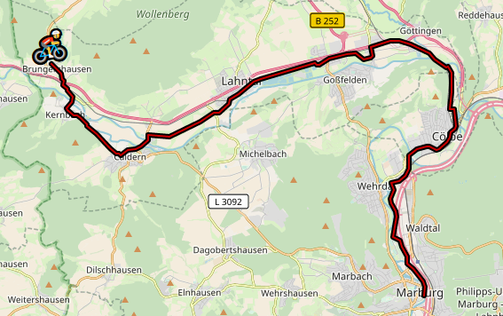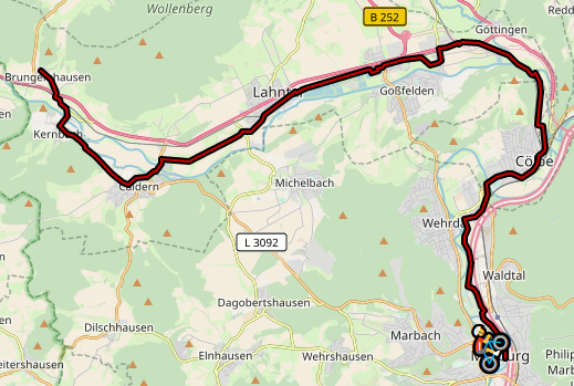 This ride is essentially the reverse version of the previous one. We ride from Marburg back through the Lahn Valley. Both routes are rideable as a tour, at the end of the route Incyclist automatically starts the return trip or the outward trip.