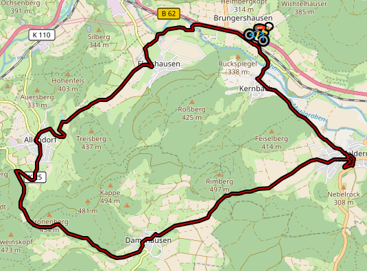 The Wetterhöhe is the highest point (502 m) of an asphalted forest road between Engelbach and Biedenkopf. It actually is a pass between the valley of the river Lahn and the valley of the stream Engelbach. The pass belongs to the Hessian part of the Rothaargebirge (Rothaar Mountains). The second ascent goes to Katzenbach, a small village, picturesquely embedded in the low mountain range landscape. The descent goes over a well paved dirt road that connects Katzenbach with Buchenau and is a nice ride. With a maximum slope op 16% and 580 climbing meters, the loop requires a good base condition.
